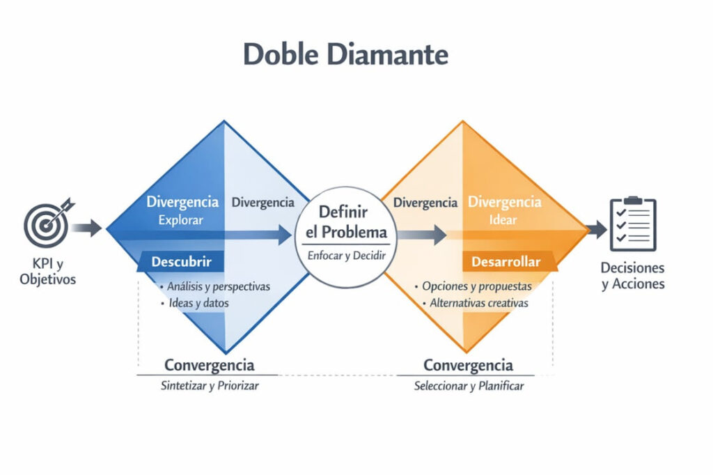 La metodología del doble diamante fue desarrollada por el Design Council del Reino Unido es ampliamente utilizada en procesos de innovación, diseño y estrategia. Su valor está en que invita a separar claramente dos momentos claves del pensamiento estratégico: La divergencia (explorar) y la convergencia (decidir).