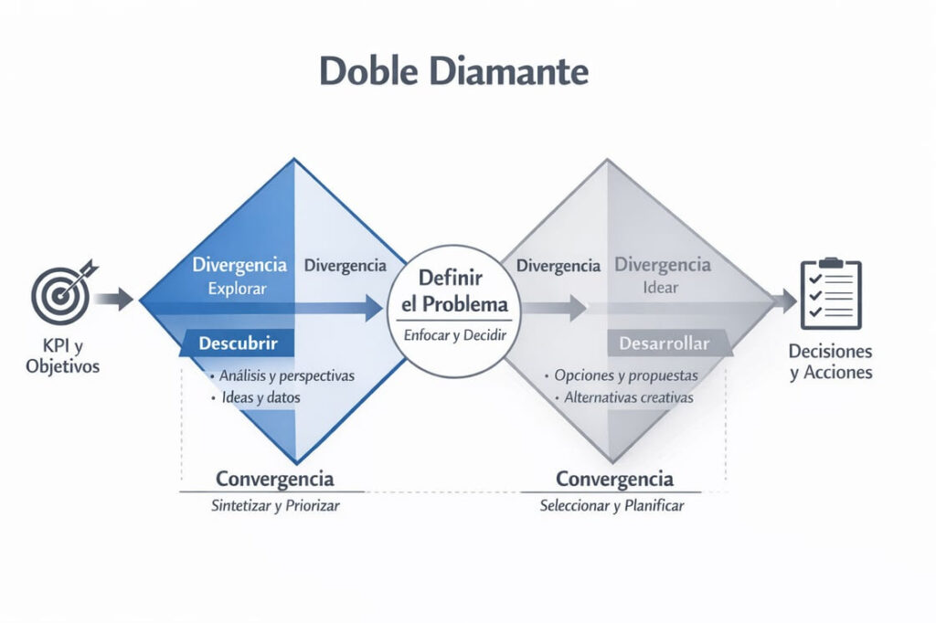Hoy quiero compartirte un paso a paso estructurado de pensamiento estratégico colectivo, bajo un marco metodológico que considero especialmente útil para planear en equipo: El Doble Diamante, asociándolo a los KPI de la empresa.